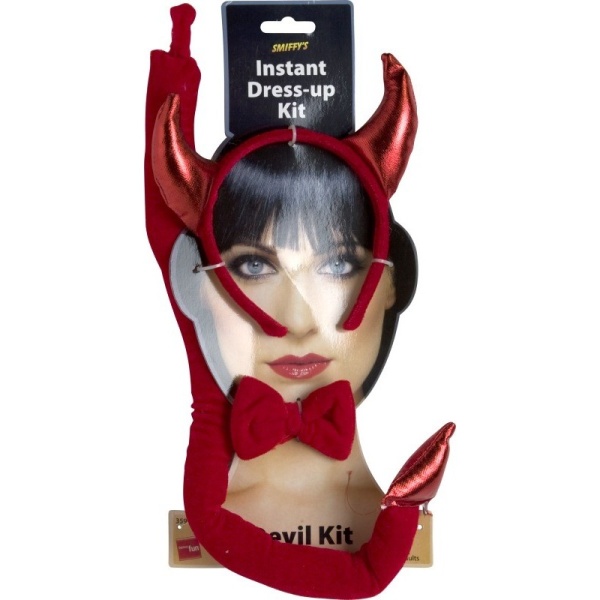 Set pre čerticu, který obsahuje červenú saténovú čelenku s rohami, červeného motýlika na krk a dlhý chvost.