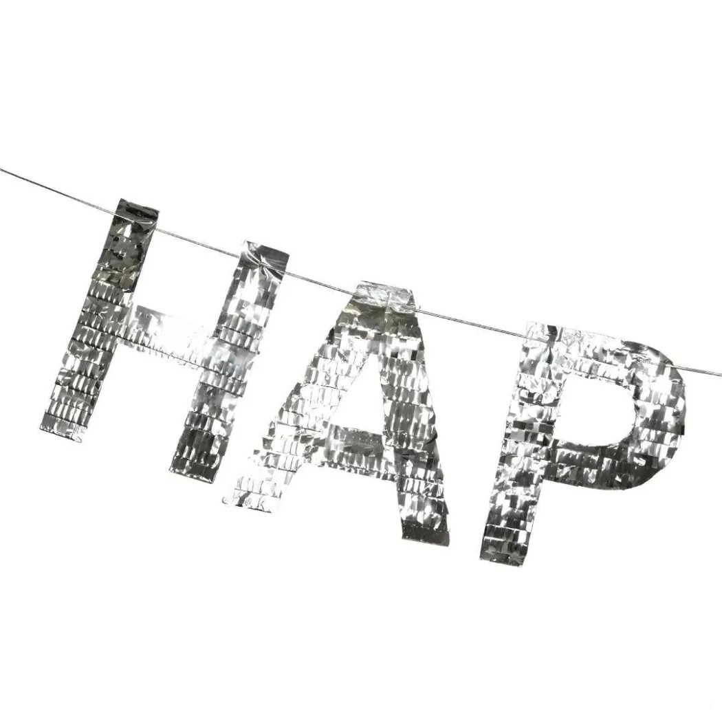 Závesný narodeninový transparent pozostáva zo strieborných písmen tvoriacich nápis "HAPPY BIRTHDAY".