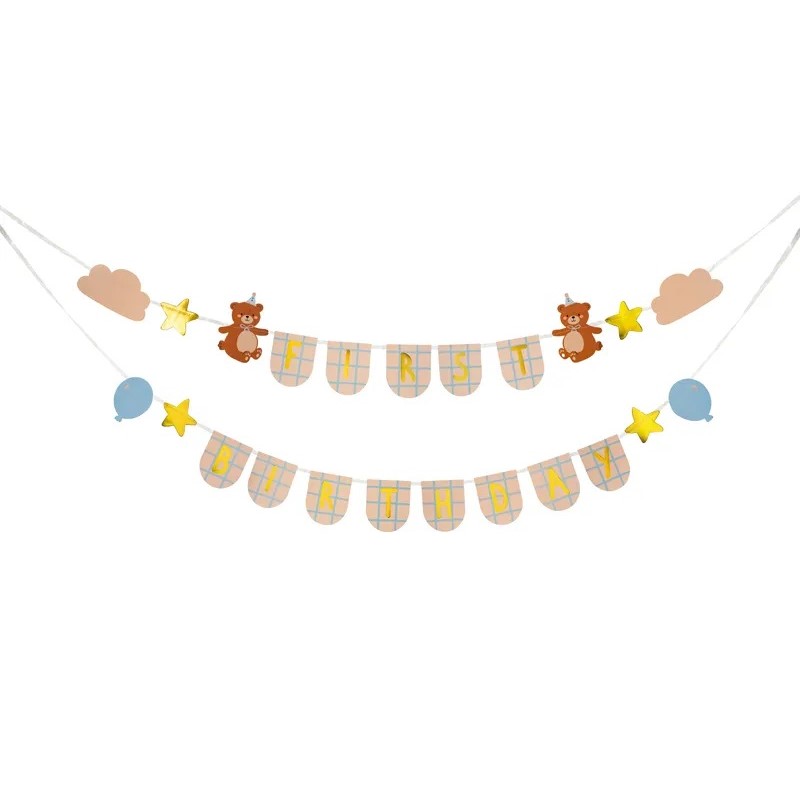 Závesná dekorácia s nápisom Happy birthday, doplnená medvedíkmi, mráčikmi a balónikmi vám nádherne doplní výzdobu 1.narodenín vášho dieťaťa.
