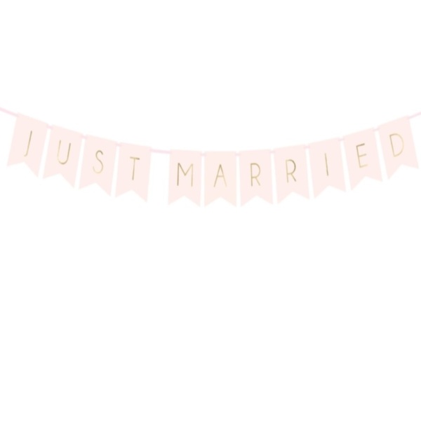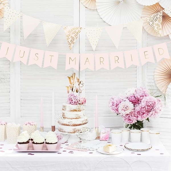 Romantická girlanda s nápisom "Novomanželia" v ružovej farbe rozbúši Vaše srdce a skrášli Váš domov.