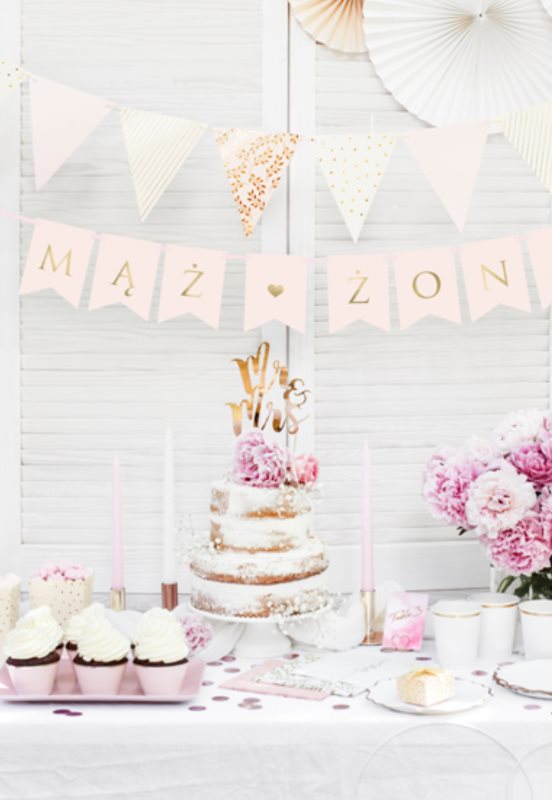 Svetloružový transparent so zlatým nápisom Mąż Żona, urob si sám, sada obsahuje písmená a cca 2,5 m svetloružovej stuhy, rozmery po zostavení: výška cca 15 cm, dĺžka cca 110 cm.