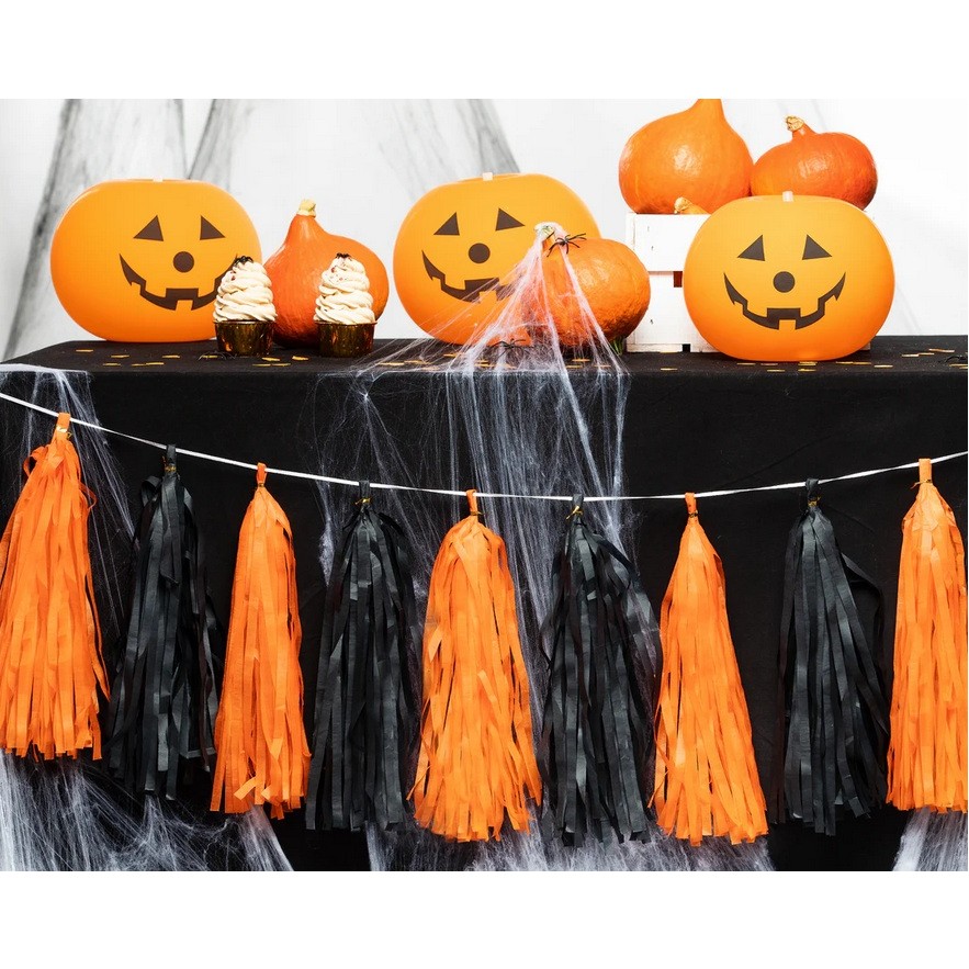 Táto girlanda obsahuje 10 strapcov v oranžovej a čiernej farbe, ktoré sú ideálne ako závesná dekorácia na halloweensku párty.