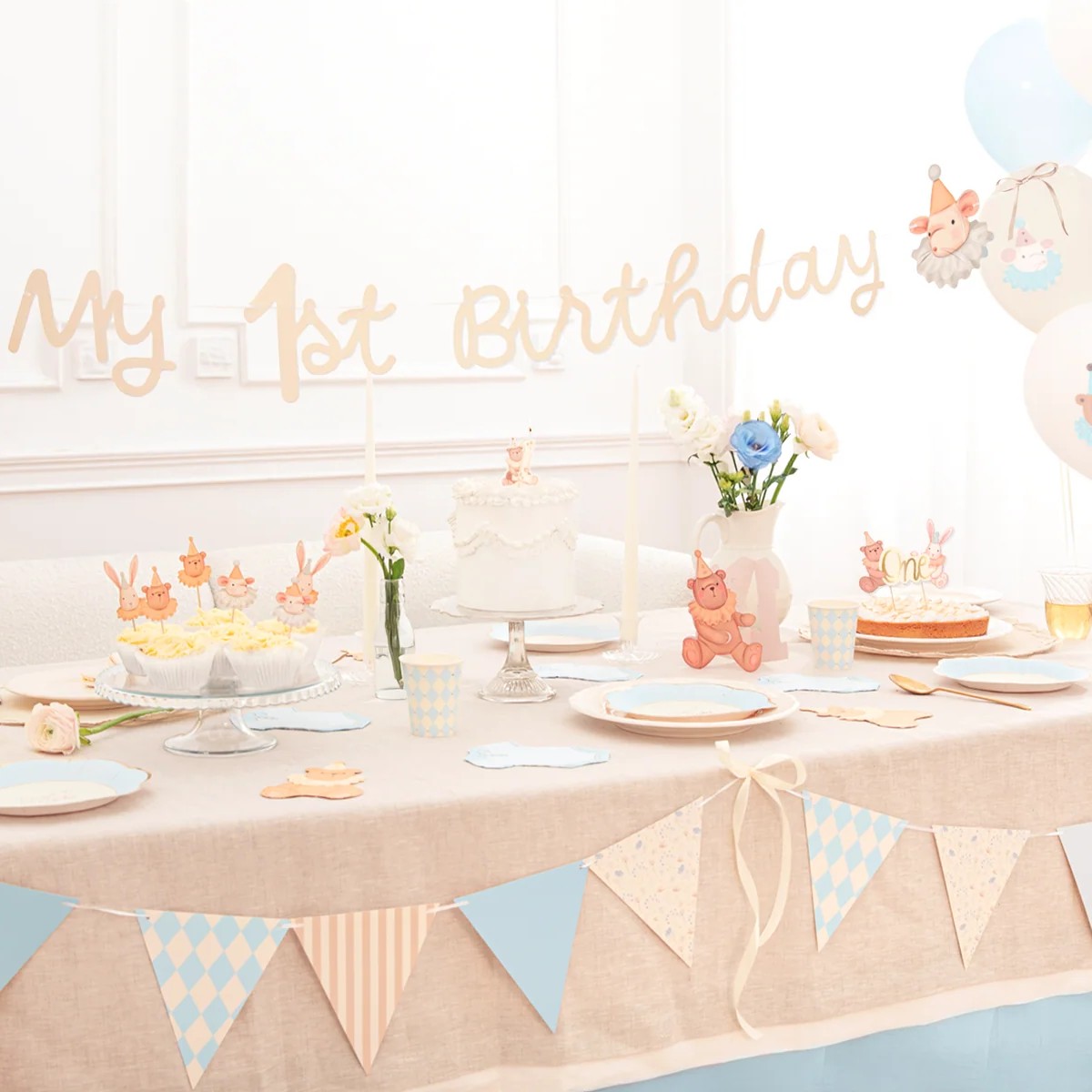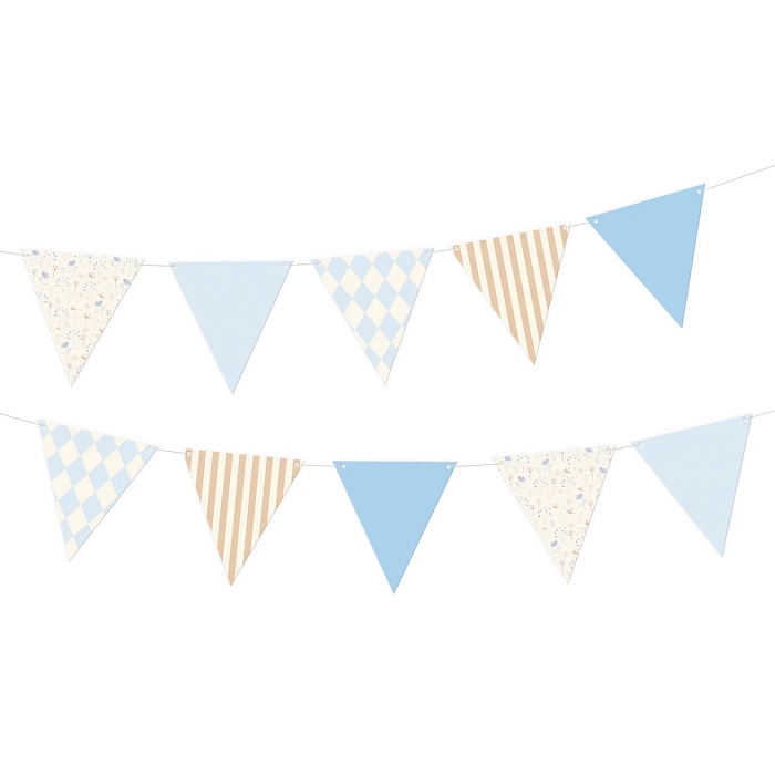 Vlajková girlanda svetlomodrej farby je jemná a zároveň výrazná dekorácia, ktorá okamžite dotvorí atmosféru detskej oslavy, oslavy príchodu dieťaťa alebo prvých narodenín malého chlapca.