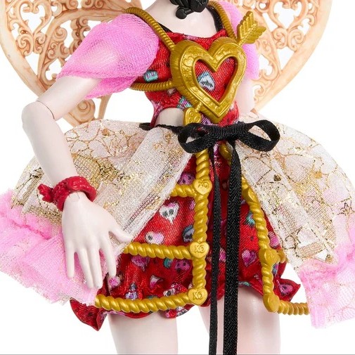 Jej spoločenský outfit má desivo nariasený strih! Z trblietavých šiat vykukujú červené nohavičky s potlačou srdiečok. Detail prepichnutého srdca so šípom a náramok s kušou dodávajú jej outfitu ešte zlatistejší nádych!