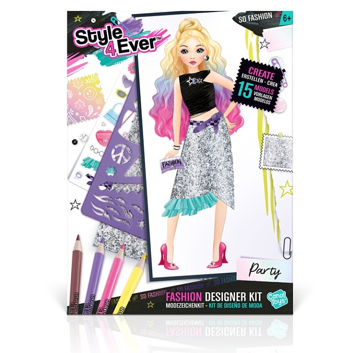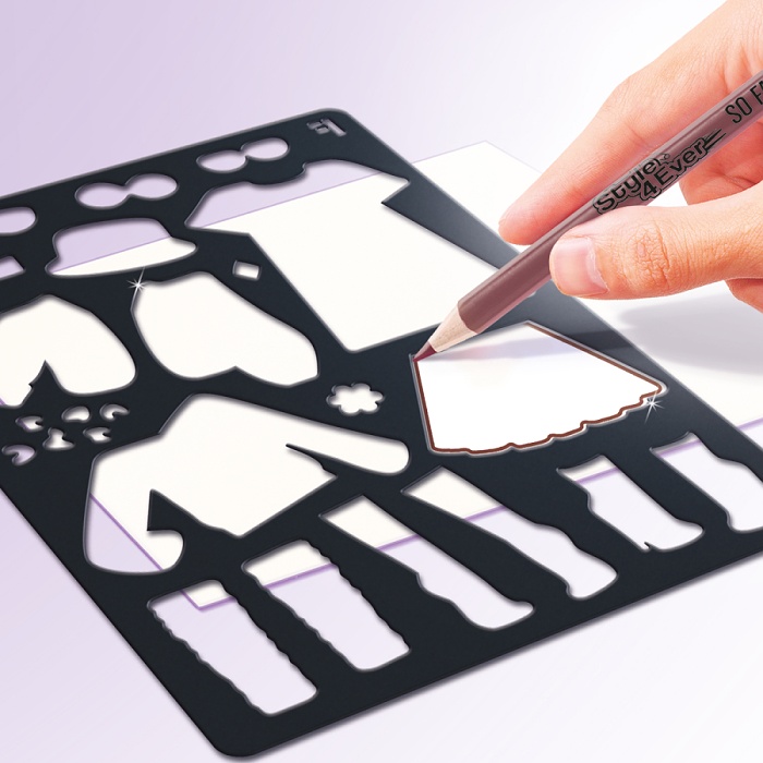 Súprava obsahuje šablóny, samolepky, nálepky, fixky, farbičky a rolky na vytvorenie jedinečných módnych návrhov.