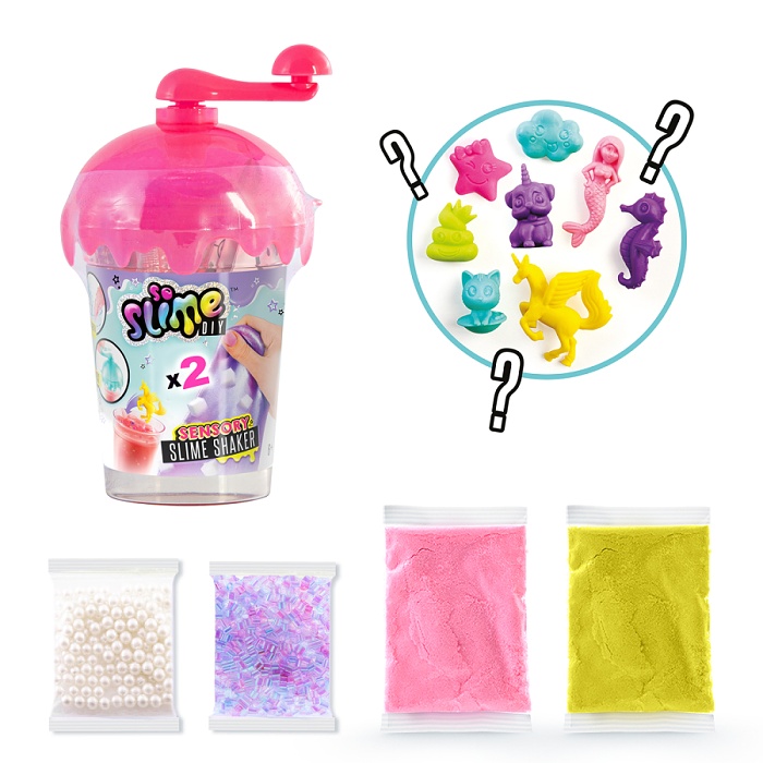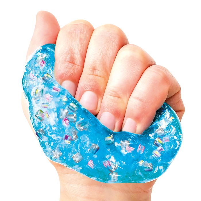 Vyrobte si vlastný sliz. Do pohára nasypte prášok a po okraj nalejte vodu. Pohár uzavrite a zmesou poriadne zatraste. Do zmesi pridajte trblietky. Potom pohár otvorte a počkajte päť minút. A sliz je hotový.