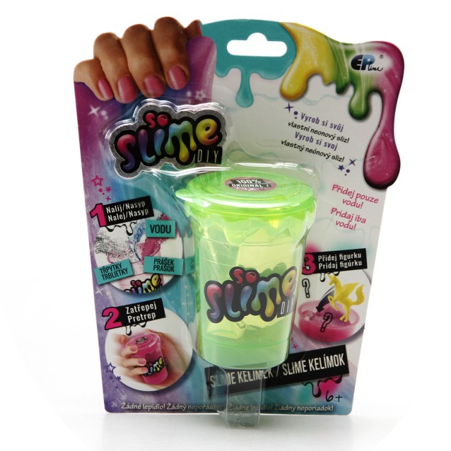 Vyrobte si vlastný sliz. Nasypte prášok do pohára, pridajte trblietky a figúrku. Nalejte vodu po okraj, zavrite pohár a zmes dobre pretrepte. Potom pohár otvorte a počkajte päť minút. Sliz je hotový. Kombinujte farby, pridajte trblietky a bavte sa so slizom.