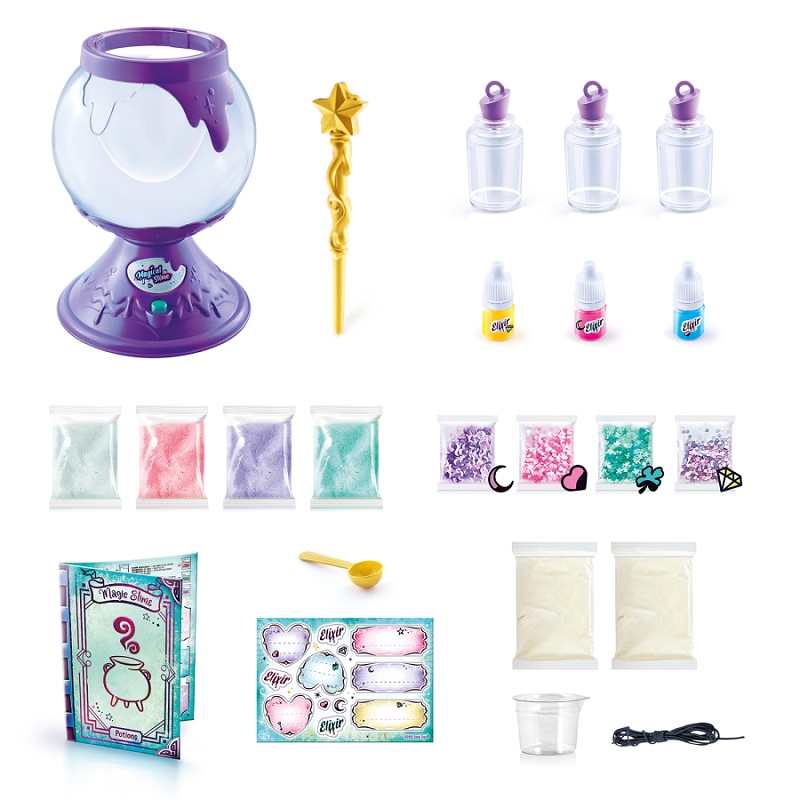 Súprava Kotlík umožňuje vyrobiť 10 magických slizových elixírov v skutočnom magickom kotlíku so svetelnými a hmlovými efektmi. Podľa receptov si môžete vyrobiť elixír meniaci farbu, svietiaci v tme alebo bublinkový elixír. Stačí pridať slizový prášok, elixír, ozdoby a zamiešať pomocou čarovnej zlatej paličky. Hotový sliz potom môžete uchovávať v krásnych fľaštičkách na elixír, ktoré si môžete zavesiť aj na krk pomocou šnúrky.