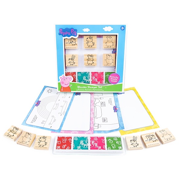 Sada drevených pečiatok Prasiatko Peppa - Zvýraznite tvorivý potenciál svojich detí s touto sadou drevených pečiatok Prasiatko Peppa. Sada obsahuje šesť jedinečných pečiatok s obľúbenými postavičkami z obľúbeného animovaného seriálu. Každá drevená pečiatka, od Peppy až po jej kamarátov, obsahuje jedinečný obrázok, ktorý možno vytlačiť na papier alebo iné materiály a vytvoriť tak zábavné a farebné výtlačky. Súprava obsahuje aj pracovné listy, ktoré si deti môžu ozdobiť a prispôsobiť pomocou pečiatok a ďalších kreatívnych nástrojov. Tieto pečiatky sú ideálne na rôzne tvorivé činnosti, od výroby kartičiek až po zdobenie obrázkov.