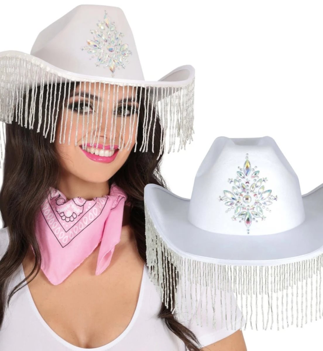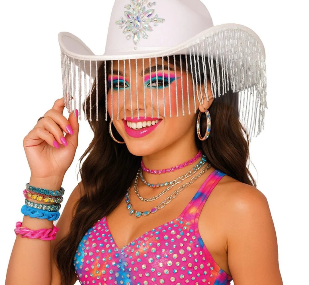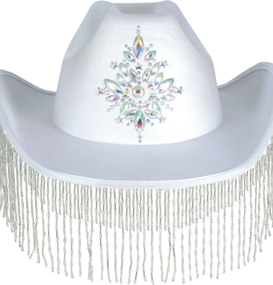 Biely dámsky kovbojský klobúk je stelesnením elegancie a štýlu na každú príležitosť. Jeho jedinečný dizajn obohatený o jemné štrasové strapce mu dodáva jedinečný charakter, ktorý ľahko upúta pozornosť.
