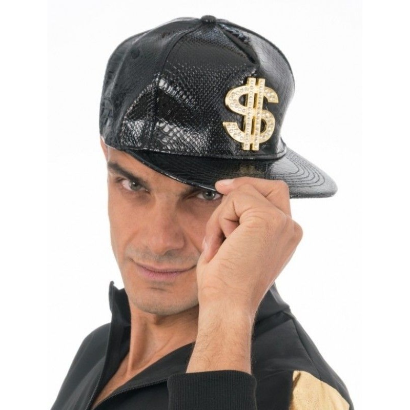 Čierny raperský klobúk z umelej kože s veľkým zlatým logom dolára je skvelou vstupenkou na párty, kde to chcete roztočiť.