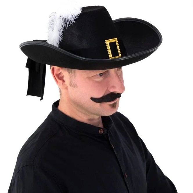 Čierny klobúk, ktorý je nevyhnutným doplnkom mušketierskeho kostýmu.