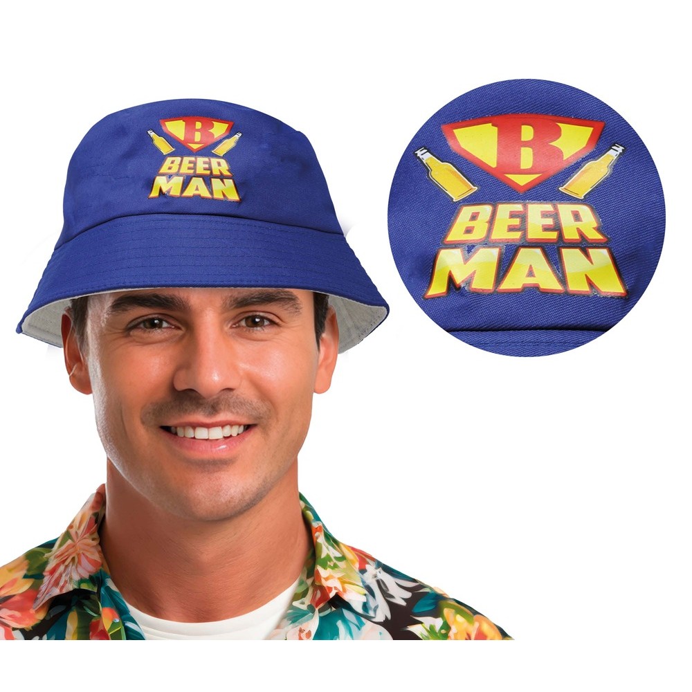 Dodajte svojmu outfitu trochu uvoľnenia a zábavy s týmto náladovým vedrovým klobúkom s vtipnou potlačou "Beer Man". Je to skvelý doplnok pre každého, kto chce na večierku, rozlúčke so slobodou, festivale alebo tematickej Pivnej párty vyniknúť z davu.