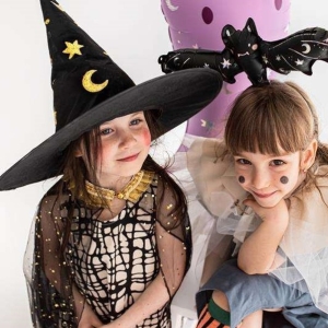 Čarodejnícky klobúk v čiernej farbe so zlatými mesiacmi a hviezdami je skvelým doplnkom