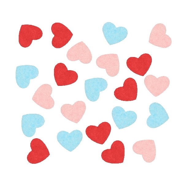 Konfety sú vyrobené z hodvábneho papiera v tvare srdiečok v pastelových farbách ružovej, svetlo modrej