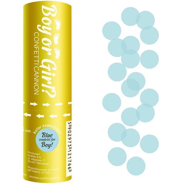 Odhaľte v pravý čas pohlavie svojho dieťaťa. Dievčatko alebo chlapček? Odpoveď na toto tajomstvo môžete svojim blízkym povedať veľmi neformálne. Trebárs na party, vystrelením konfiet v správnej farbe. Milé prekvapenie pre súrodencov, budúceho otecka aj Vašich rodičov. Tieto vystreľovacie konfety privedú Vašich hostí do extázy. Len vy viete, aké prekvapenie tubus skrýva. Tieto konfety sú v modrej farbe a patria k narodeniu chlapčeka