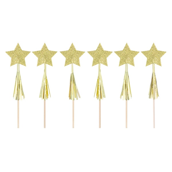| Zlaté toppery na tortu alebo cupcake v tvare hviezdy so strapcami Farba: strieborný lesk Výška: 11,5 cm Balenie: 6 … |