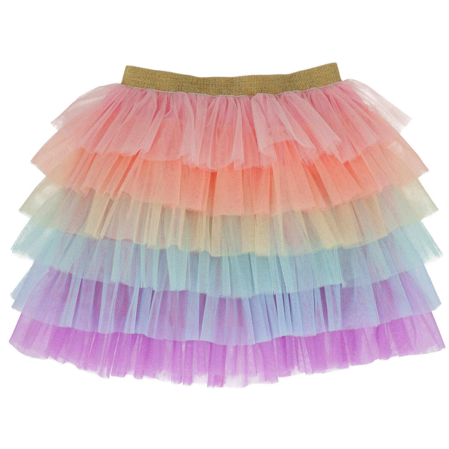 Obsahuje čelenku a sukňu. Sukňa je vyrobená z ružovej látky pripomínajúcej satén, vďaka ktorej sa veľmi pohodlne nosí, so zlatým elastickým pásom. Od pása sa kaskádovito ako vodopád spúšťa niekoľko vrstiev tylu v pastelových dúhových farbách.