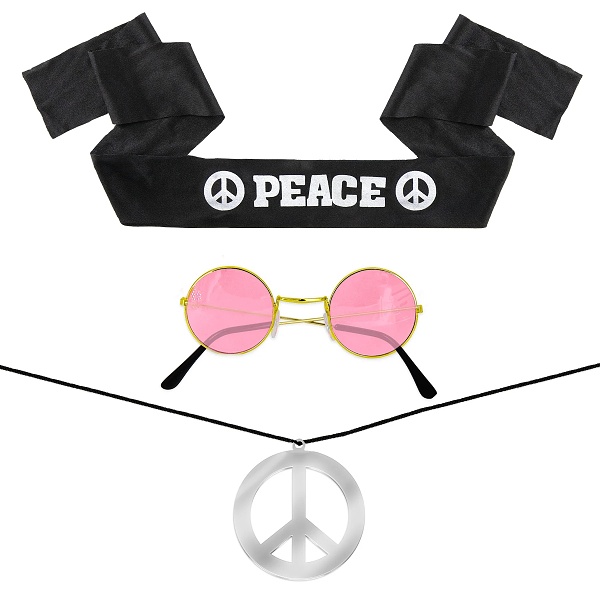 Sada obsahuje: čiernu čelenku so znakom mieru a nápisom "Peace", ružové okuliare Lennon so zlatými rámami a striebornými