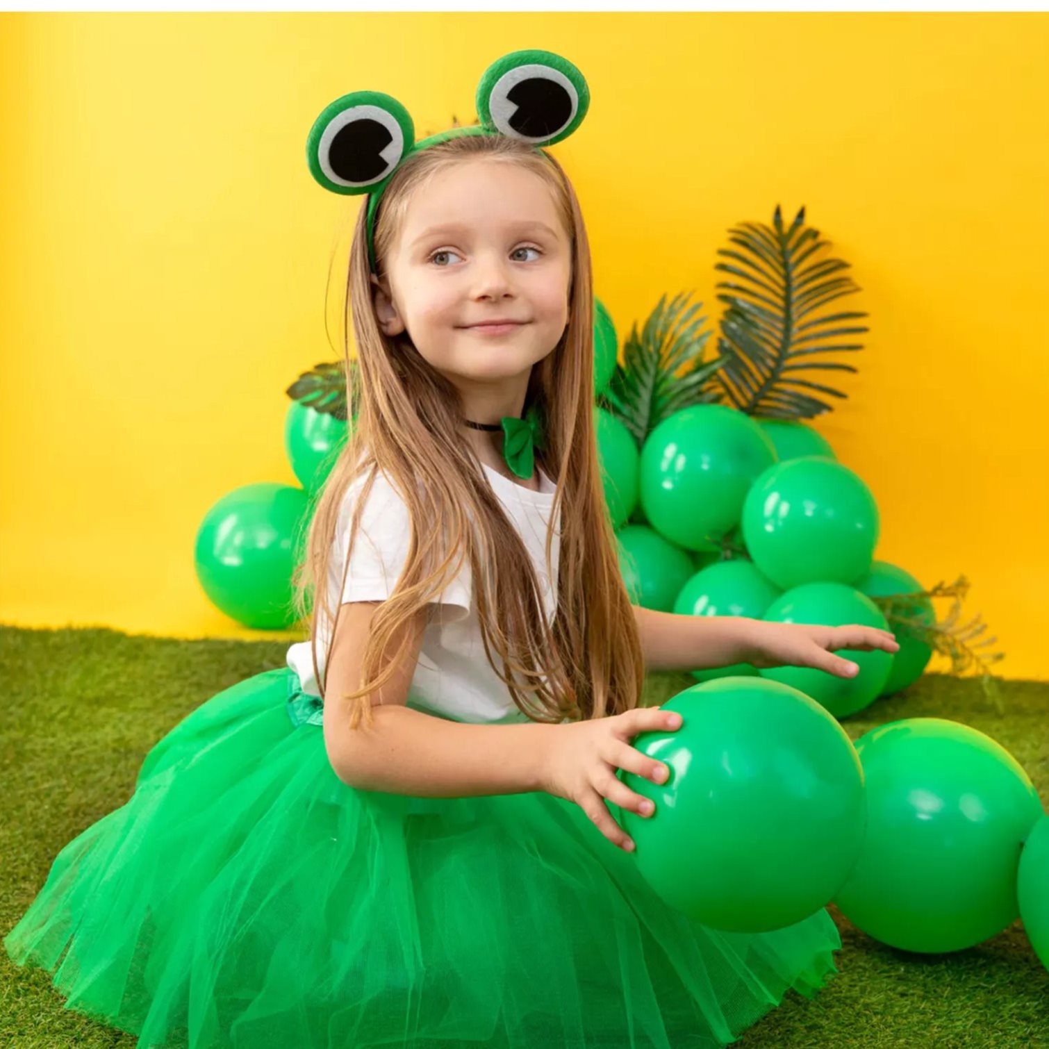Párty doplnky na dokončenie žabieho kostýmu vrátane čelenky, motýlika a chvosta.