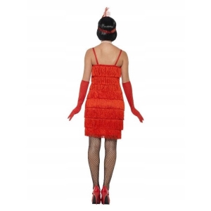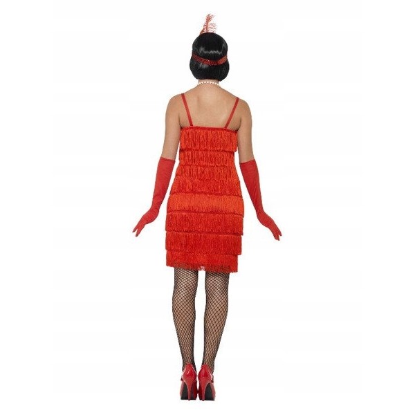Krásne jasne červené šaty v štýle charlestonu z 20. rokov 20. storočia s ramienkami, vpredu a vzadu zdobené strapcami