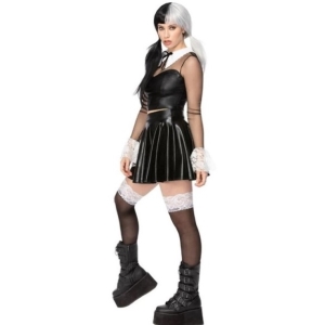 Gotický kostým Sexy školáčky obsahuje mini sukienku vo vzhľade vinylu a skráteného topu, zdobeného bielou čipkou v podobe goliera a manžiet. Kostým zdobia čierne priesvitné rukávy. V tomto kostýme získate dokonalý vzhľad.