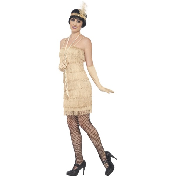 30. roky sa vyznačovali nielen charlestonom, ale aj jazzom. K tomu patrila aj táto veľmi elegantná móda, ako sú tieto zlaté flapper šaty so strapcami v štýle štýl "Veľký Gatsby". Zapínajú sa na boku na zips.