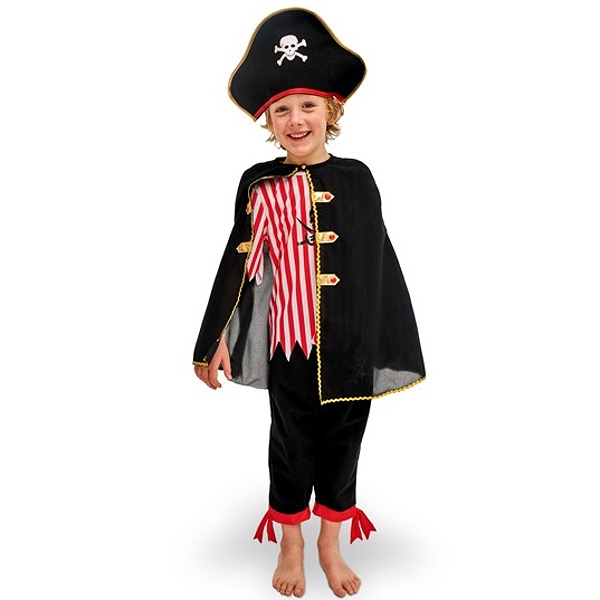 Detský kostým piráta je v čiernej, červenej a bielej farbe so zlatými detailmi