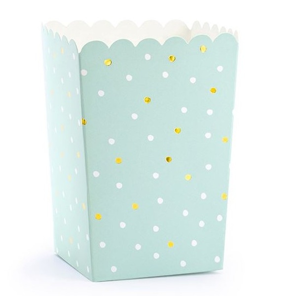 Papierová krabička mintová s motívom bielych a zlatých bodiek je vhodná nielen na popcorn, ale tiež chrumky či čipsy.