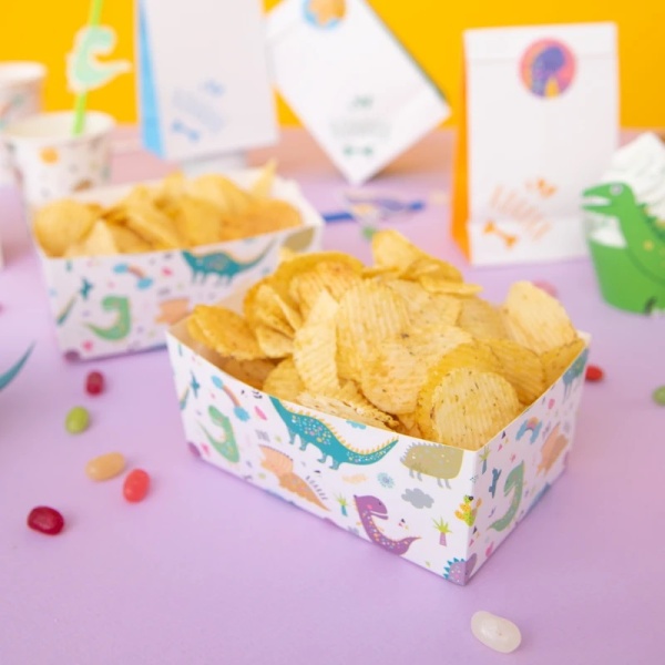 Krabičky na chipsy, popcorn a iné slané aj sladké občerstvenie s krásne farebnými dinosaurami.