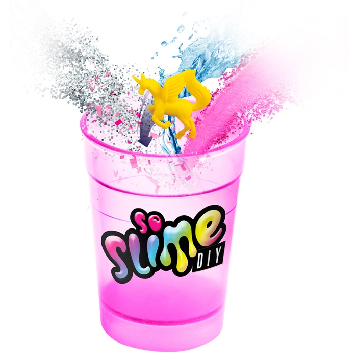 Vyrobte si vlastný sliz. Nasypte prášok do pohára, pridajte trblietky a postavičku.