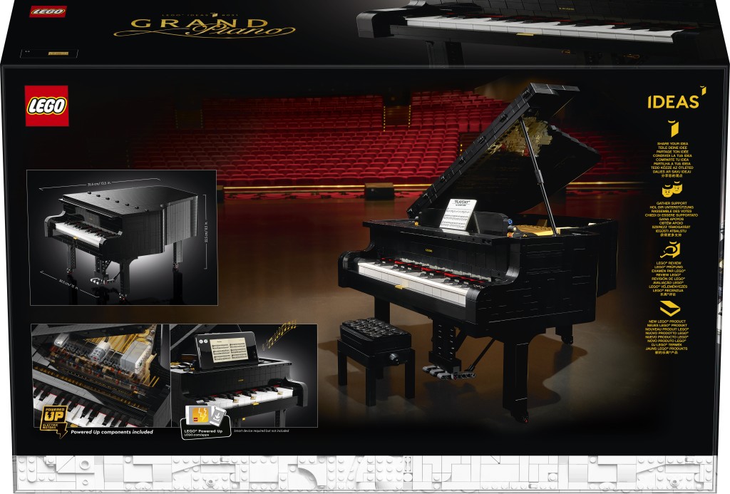 - Veľký klavír (21323) zo série LEGO® Ideas obsahuje odnímateľnú klaviatúru s 25 klávesmi, autentické kladivko, pohyblivé tlmiče, pedál a motor. V kombinácii s aplikáciou LEGO Powered Up potom môžeš predviesť svoj talent alebo zahrať automaticky prehrávanú melódiu.