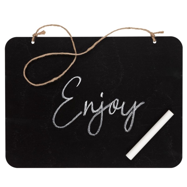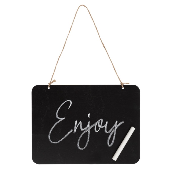 Závesná čierna tabuľka s kriedou má praktické pútko z prírodnej juty, za ktoré ju môžete kamkoľvek zavesiť.