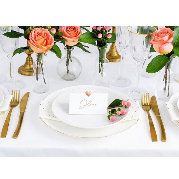 Biela svadobná menovka s metalizovaným srdcom v ružovej farbe.