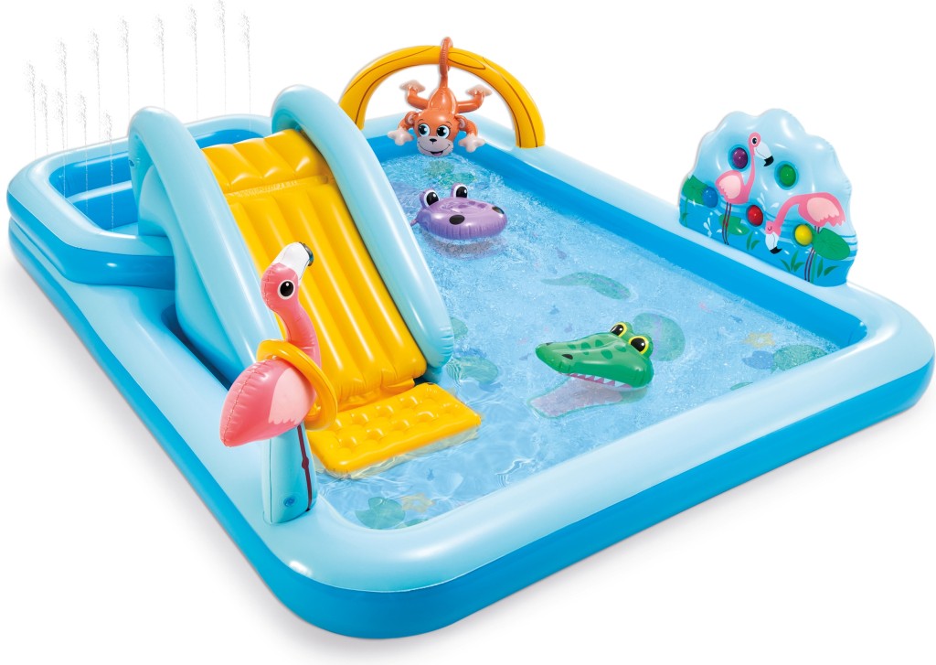 - Obsahuje tobogán, nafukovaciu palmu, plameniaka, opicu, hracie krúžky a 5 balónov