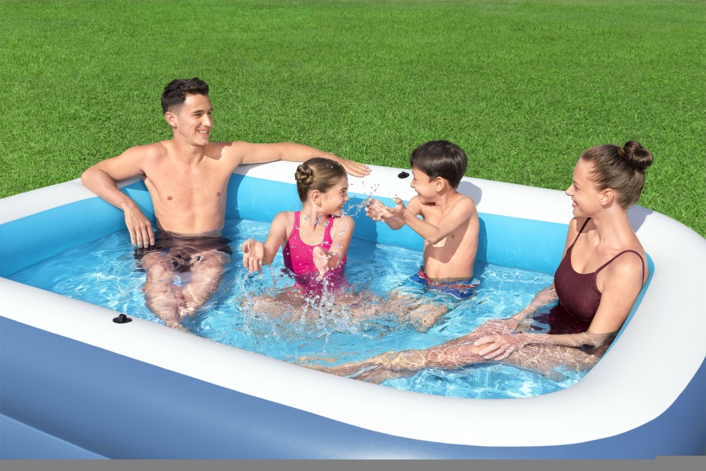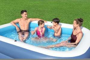 - Obdĺžnikový rodinný bazén s rozmermi 2,54 m x 1,78 m x 1,40. Súčasťou je slnečná clona. Vrátane opravnej záplaty. Objem vody je 778 litrov a bazén má vypúšťací ventil.