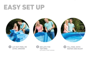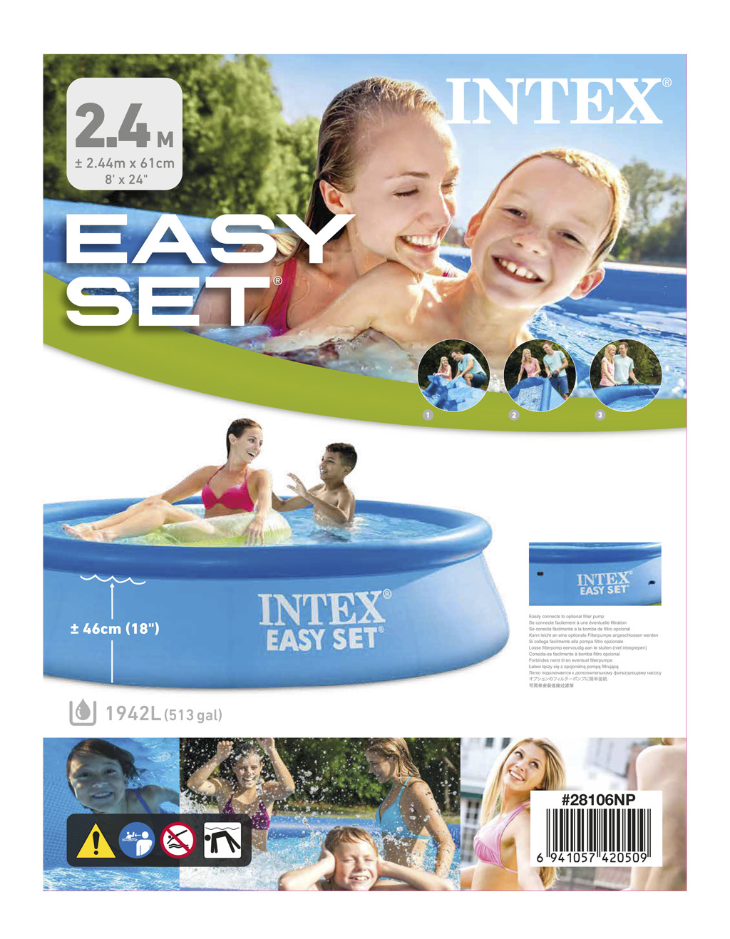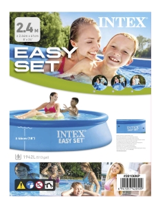 - Bazénová súprava s rozmermi 2,44 m x 61 cm. Objem vody (80 % výšky steny bazéna) je 1940 litrov. Bazén je pripravený na napustenie do 10 minút. Balenie obsahuje bazénovú súpravu bez filtračného čerpadla. Hmotnosť celého balenia je 5,6 kg. Bazén je vhodný pre deti od 6 rokov.