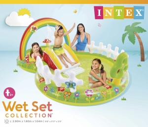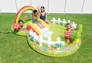 - Nafukovacie centrum v záhradnom dizajne s rozmermi 2,90 m x 1,80 m x 1,04 m. Vodná tryska. Súčasťou výrobku je šmykľavka a ďalšie hracie prvky - 2 nafukovacie špongie, 4 motýliky a 3 loptičky. Súčasťou výrobku je aj jedna nafukovacia podložka navyše. Vypúšťacia zátka v spodnej časti bazéna. Objem bazéna je 450 litrov a výška steny je 13 cm. Maximálna nosnosť je 54 kg. Súčasťou balenia je opravná záplata. Vhodný pre deti od 2 rokov.