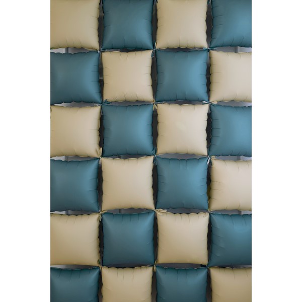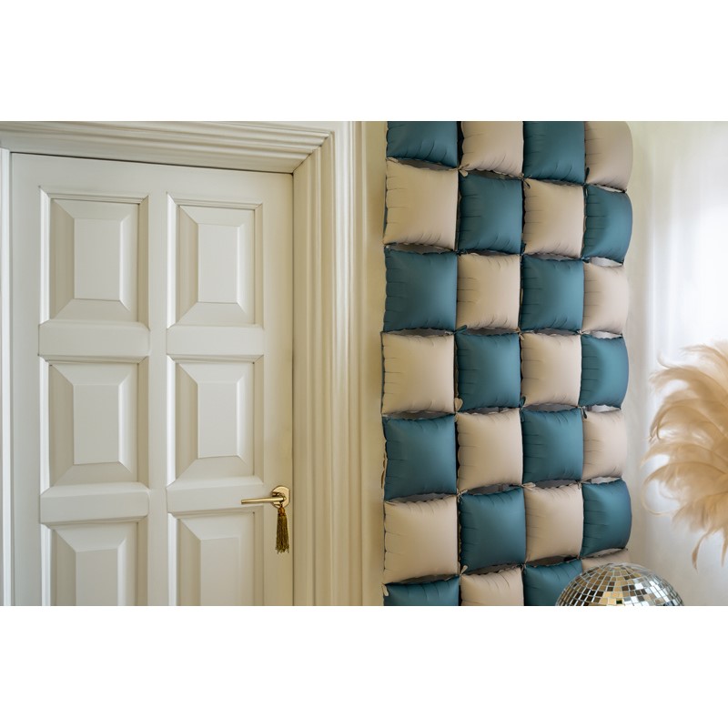 Balónová stena z béžových a modrých štvorcových balónov z hliníkovej fólie vytvára vrstvený vizuálny efekt.