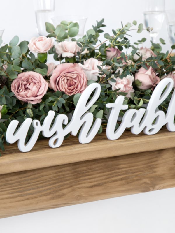Nápis Wish table z dreva v bielej farbe, sada obsahuje nápisy ''wish'' (veľkosť cca 17 x 10 cm) a ''table'' (veľkosť cca 18,5 x 9,5 cm).