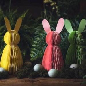 Papierová voštinová dekorácia, zobrazujúca zeleného zajačika.