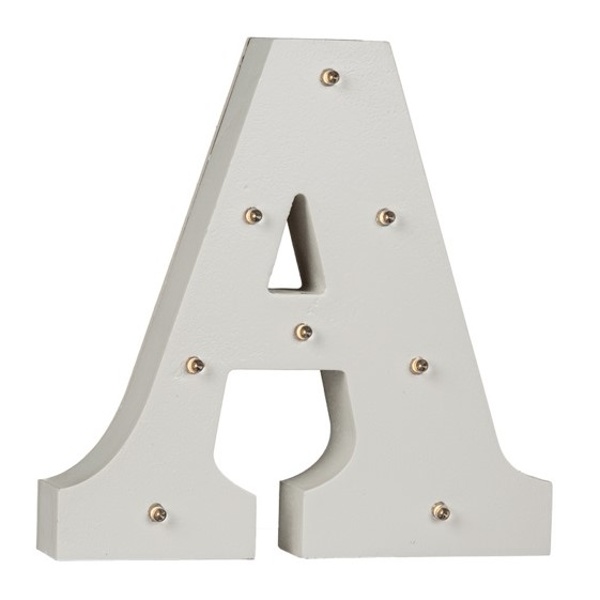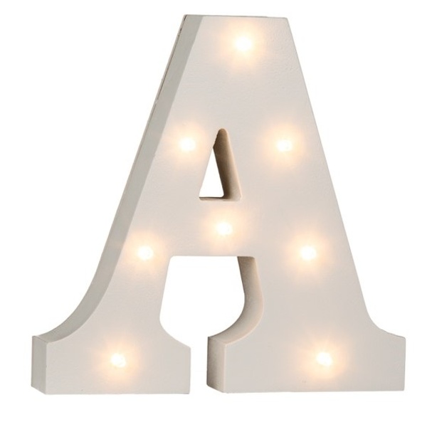 Svietiace písmeno A s LED žiarovkami pre štýlové osvetlenie a originálnu dekoráciu.