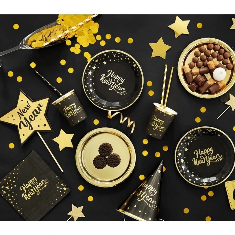 Čierne obrúsky so zlatými hviezdičkami a nápisom Happy New Year.