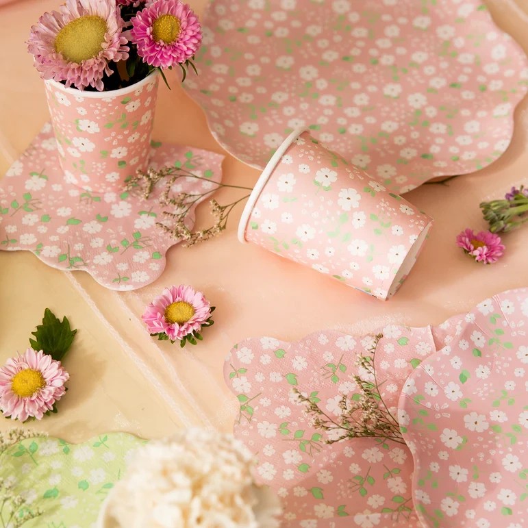 Krásne papierové obrúsky pastelových farieb s potlačou bielych lúčnych kvetov a vrúbkovaným okrajom.