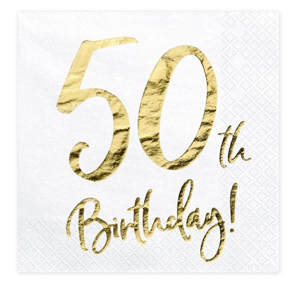 Biele 3-vrstvové servítky so zlatým nápisom k oslave jubilejných 50. narodenín.