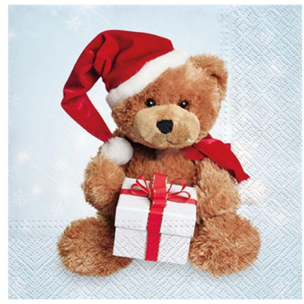 Vianočný obrúsok s medvedíkom s čiapkou a darčekom