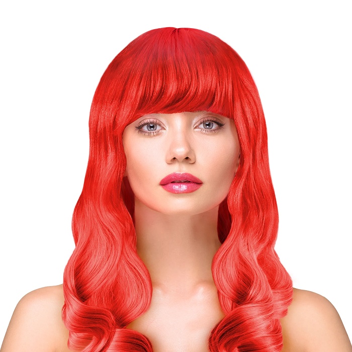 Dámska parochňa s dlhými červenými vlnitými vlasmi a ofinou