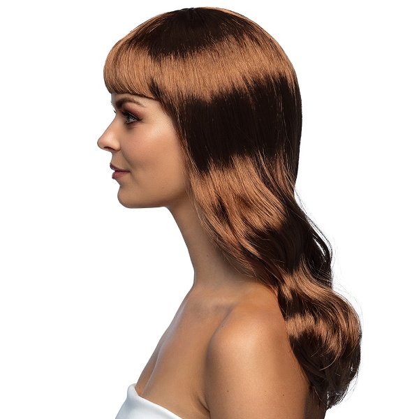 Dámska hnedá parochňa s dlhými vlasmi má prirodzený vzhľad a je vyrobená zo syntetických vlasov.