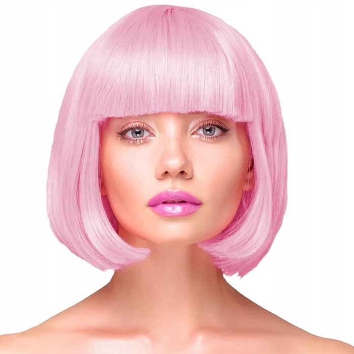 Dámska parochňa s krátkymi ružovými vlasmi s ofinou dodá vášmu outfitu farebný akcent.