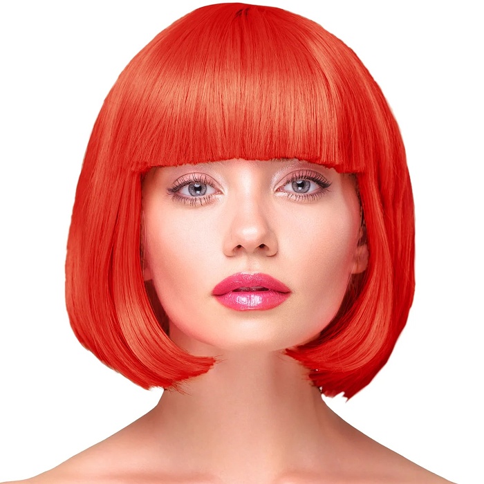 Dámska parochňa s krátkymi červenými vlasmi s ofinou dodá vášmu outfitu farebný akcent.